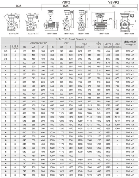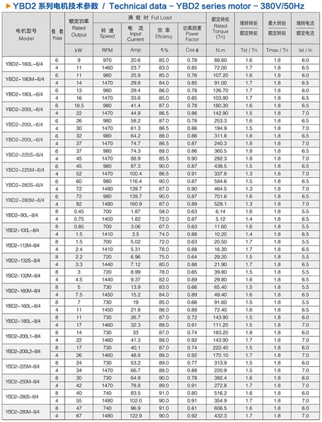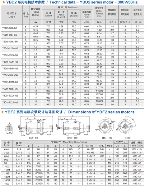 YBD2系列隔爆型变极多速三相异步电动机是YB2系列隔爆型三相异步电动机的派生产品。本系列电机采用单绕组变极方法实现转速变换,用户使用时只需选择相应的接法,即可使电机以对应的转速转动。 YBD2系列电机适用于各种需要有级调速的机械设备,主要用于煤矿、石油天然气、石油化工和化学工业等需要防爆的行业,通常用于驱动泵、风机、压缩机和其他传动机械。 YBD2系列电机防爆标志分为:Exd I ,Exd II AT4和Exd II BT4,其中ExdI适用于有甲烷或煤尘爆炸性气体混合物存在的煤矿工作面环境;Exd II AT4和Exd II BT4适用于工厂用II类A级、B级,温度组别为T1、T2, T3和T4组的爆炸性气体混合物存在的环境。