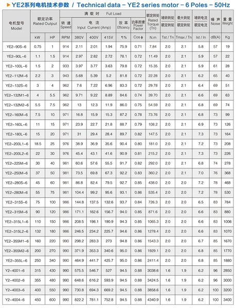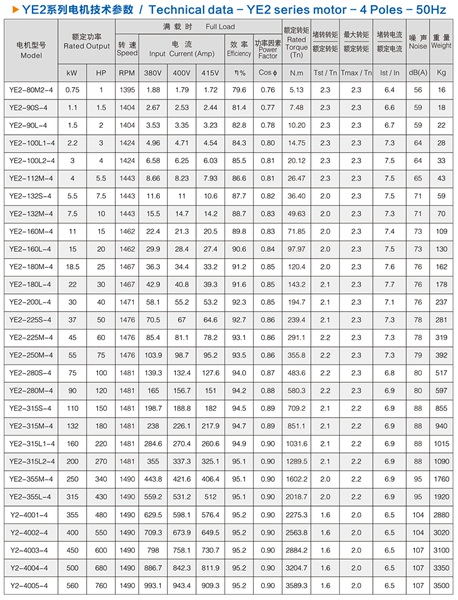 YE2系列是本公司依据JB/T11707-2013最新开发的全封闭自扇风冷式鼠笼型高效率三相异步电动机.该系列电动机的效率指标达到中国GB18613-2012《中小型三相异步电动机能效限定值及能效等级》中的3级能效,符合IEC60034-30标准中的IE2能效等级。YE2系列高效率三相异步电动机可用于驱动风机、泵类等长期负载运行,各项性能指标达到国际先进水平,高效从而达到节能减排的目的。 YE2高效率三相异步电动机的安装尺寸、功率等级符合国际电工委员会IEC60072-1标准,中心高H160及以上电机可配装不停机注排油装置,并预留有安装热敏电阻和防潮加热带的空间,方便用户选用。温升按80K考核,电动机温升裕度大,寿命长;转子采用铸铝工艺,运行可靠性高。 该系列电动机功率范围:0.75kW-375kW;机座中心高:H80-H355。