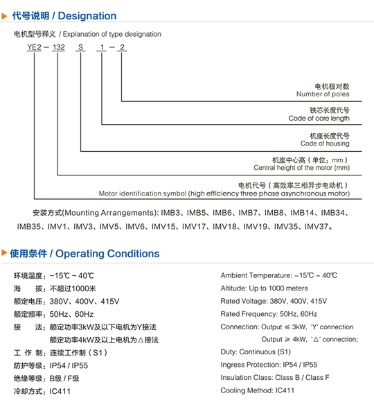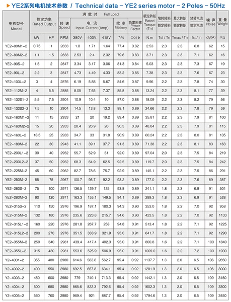 YE2系列是本公司依据JB/T11707-2013最新开发的全封闭自扇风冷式鼠笼型高效率三相异步电动机.该系列电动机的效率指标达到中国GB18613-2012《中小型三相异步电动机能效限定值及能效等级》中的3级能效,符合IEC60034-30标准中的IE2能效等级。YE2系列高效率三相异步电动机可用于驱动风机、泵类等长期负载运行,各项性能指标达到国际先进水平,高效从而达到节能减排的目的。 YE2高效率三相异步电动机的安装尺寸、功率等级符合国际电工委员会IEC60072-1标准,中心高H160及以上电机可配装不停机注排油装置,并预留有安装热敏电阻和防潮加热带的空间,方便用户选用。温升按80K考核,电动机温升裕度大,寿命长;转子采用铸铝工艺,运行可靠性高。 该系列电动机功率范围:0.75kW-375kW;机座中心高:H80-H355。